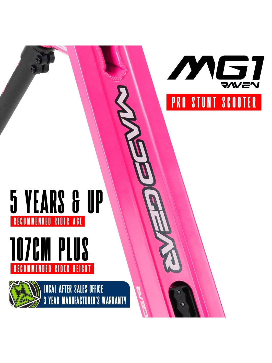 The Madd Gear MG1 Raven Pro Scooter is designed to be the ultimate ride for kids 5 years and up who are ready to shred at their local skatepark. Whether you're learning your first tricks or refining your skills, this scooter is built tough to handle everyday stunt riding.