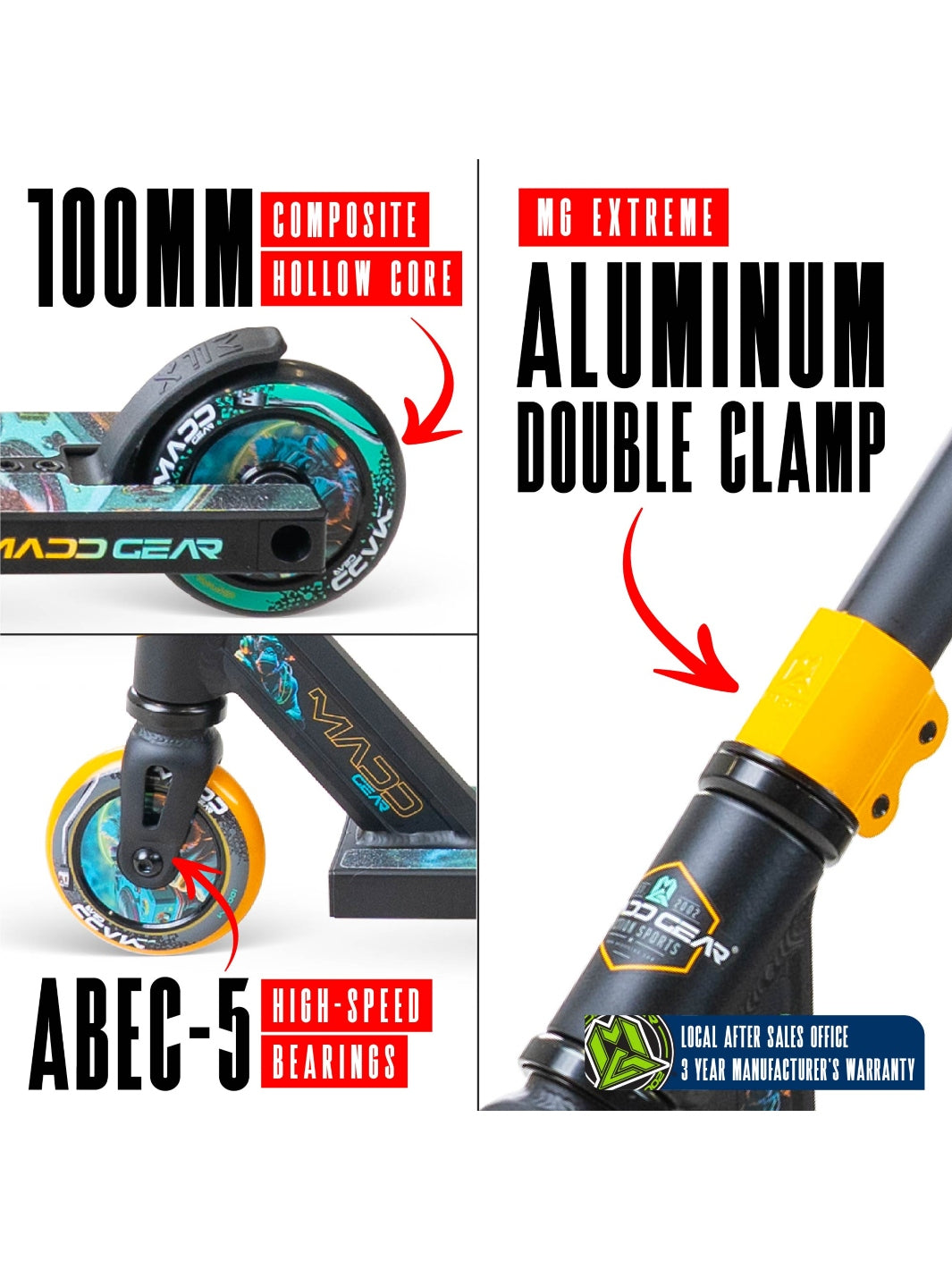 Glide smoothly with 100mm 88A composite hollow core wheels and precision ABEC-5 bearings, giving you the speed and control you need to dominate any line. From ramps to rails, this scooter is dialed straight out of the box—just slide on the bars, tighten the clamp with the included tool, and you’re ready to ride.