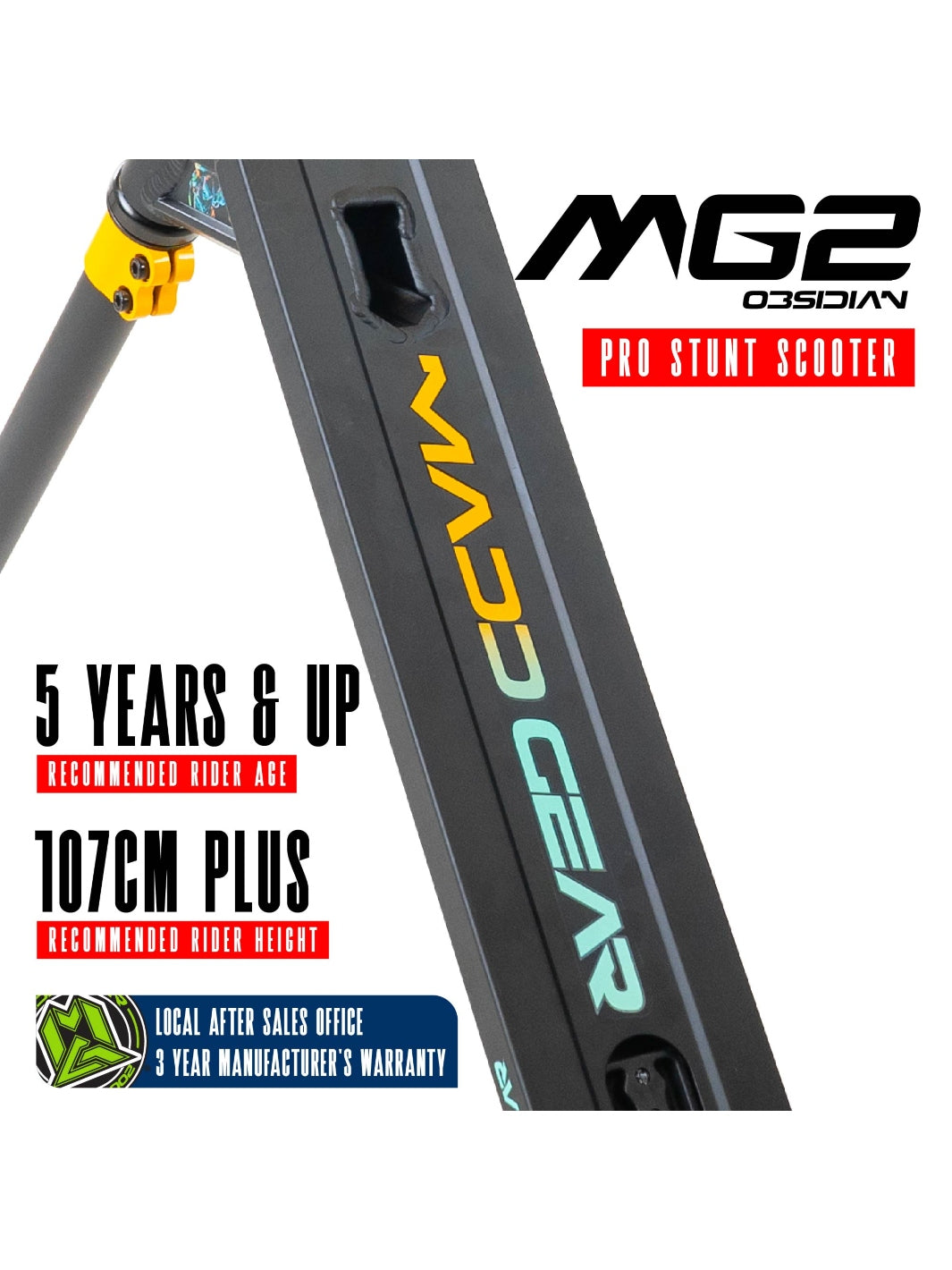 The Madd Gear MG2 Obsidian Pro Scooter is designed to be the ultimate ride for kids 5 years and up who are ready to shred at their local skatepark. Whether you're learning your first tricks or refining your skills, this scooter is built tough to handle everyday stunt riding.