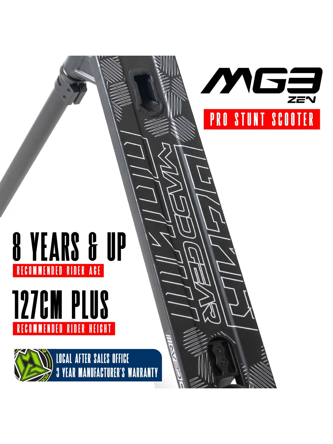 The MG3 Zen is the natural next step up from the MG1 and MG2, designed for kids who are growing and riding more confidently. Best suited to riders from around 127cm tall, it features a wider deck and taller bars, giving riders more room and comfort as they progress.