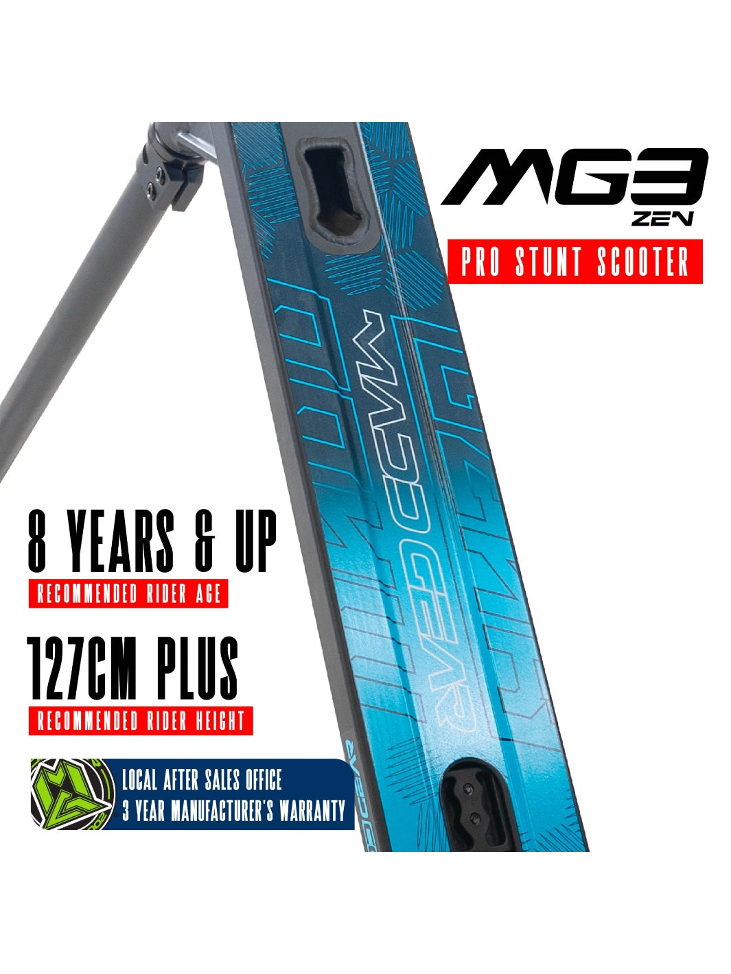 The Madd Gear MG3 Zen Pro Scooter is designed to be the ultimate ride for kids 8 years and up who are ready to shred at their local skatepark. Whether you're learning your first tricks or refining your skills, this scooter is built tough to handle everyday stunt riding.